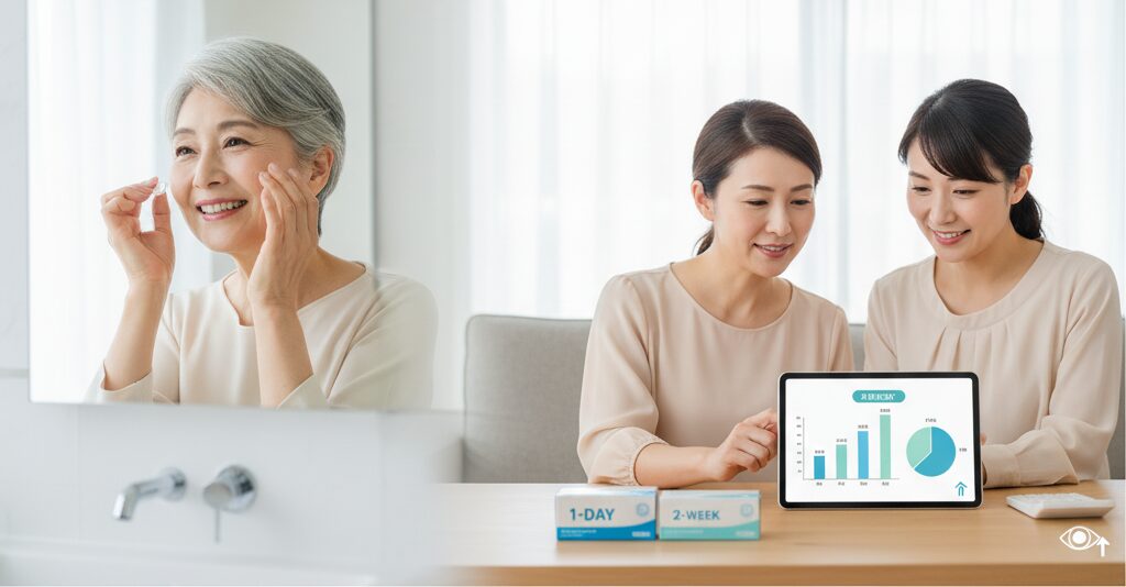 - 素材の進化:特に、目に多くの酸素を届けることができる「シリコーンハイドロゲル」は、従来の素材よりも目の健康に良いとされ、価格が高くなる傾向があります。目の乾燥感を軽減し、長時間の快適な装用をサポートするための重要な要素です。