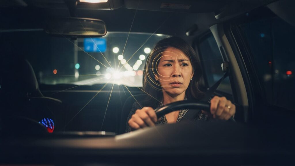 - 暗い場所での見えにくさ(ハロー・グレア):夜間や薄暗い場所では、より多くの光を取り込もうと瞳孔が自然に大きくなります。すると、レンズの近用部分と遠用部分の両方から光が入ってくるため、対向車のヘッドライトや街灯などの光がにじんで見えたり(ハロー)、まぶしく感じたり(グレア)することがあります。特に夜間の運転には慎重さが求められます。